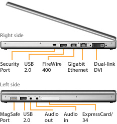 Par rapport à son prédécesseur, le MacBook Pro intègre une caméra iSight, une télécommande et donc FrontRow mais perd par contre (ce qui est regrettable) le Firewire 800, le modem et aussi le connecteur S-Vidéo, ce qui fait beaucoup tout de même. Espérons que le Firewire 800 soit de retour dans de futures machines surtout qu’Intel a annoncé l’intégrer sur ces cartes mères.